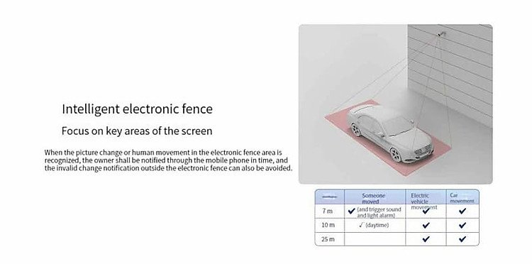 Điểm mới của camera ngoài trời Xiaomi AW300 là bạn có thể tùy ý đặt vùng lấy nét trong ứng dụng Xiaomi Home. Đồng thời qua app này bạn còn nhận báo động khi nó phát hiện thấy các chuyển động đáng ngờ. Phạm vi phát hiện được kiểm nghiệm bởi Moshontek AI Labs. Trong điều kiện ban ngày, camera có thể phát hiện xe máy, ô tô đang chuyển động với khoảng cách lên đến 25 mét.