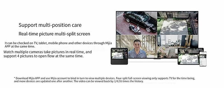 Với nhu cầu theo dõi nhiều góc độ khác nhau, Xiaomi AW300 cung cấp chế độ chia màn hình để xem hình ảnh trực tiếp. Bạn có thể giám sát bằng các thiết bị như TV, máy tính bảng và điện thoại di động,… Thông qua ứng dụng Mi Home/Xiaomi Home để xem cảnh quay trực tiếp tới 4 camera cùng lúc.