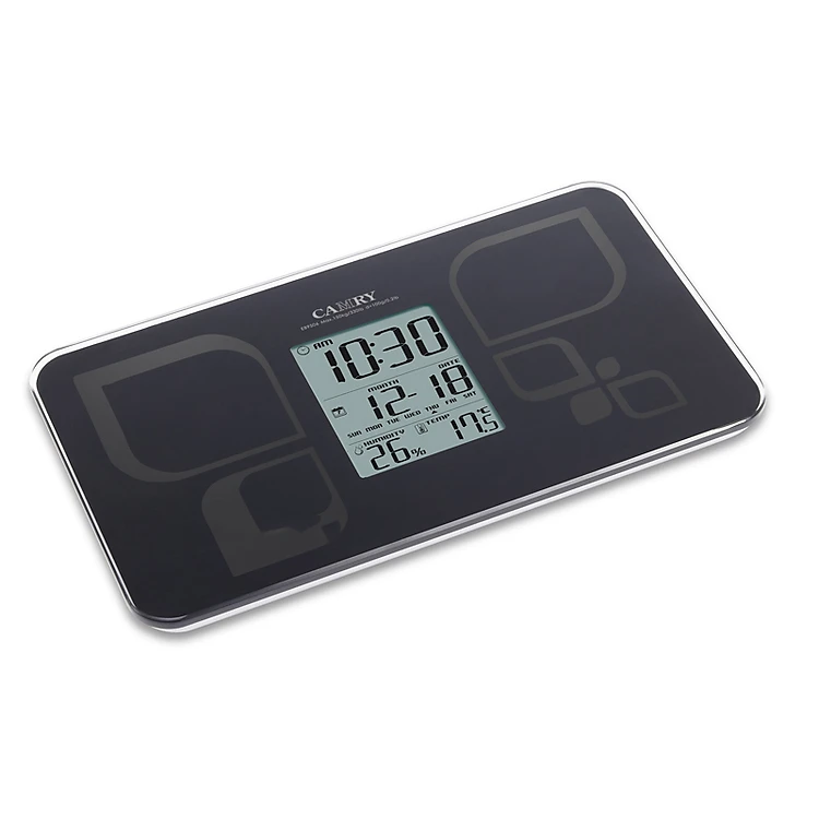 Cân Điện Tử Camry EB9506_S677 với thiết kế sang trọng, hiện đại sẽ mang đến cho bạn sự tiện dụng tối đa trong sinh hoạt cá nhân. Bên cạnh tính năng cân, Camry EB9506_S677 còn có tính năng đo nhiệt độ ở trong phòng và kết hợp với tính năng đo độ ẩm giúp người dùng có thể biết được nhiệt độ trong phòng, lịch hiển thị tháng, ngày và thứ. Kiểu dáng gọn nhẹ, cân có thể được đặt trên bàn làm việc để làm vật trang trí sang trọng.