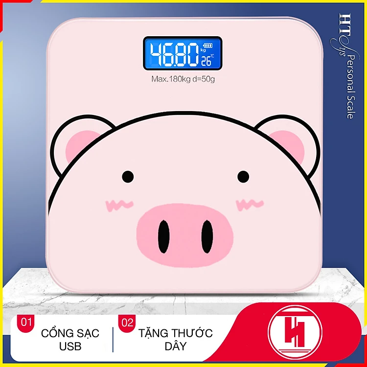 Cân điện tử sức khỏe HT SYS - 180KG-Cổng sạc USB - Hình Heo PiuPiu Hồng ( Tặng thước dây )