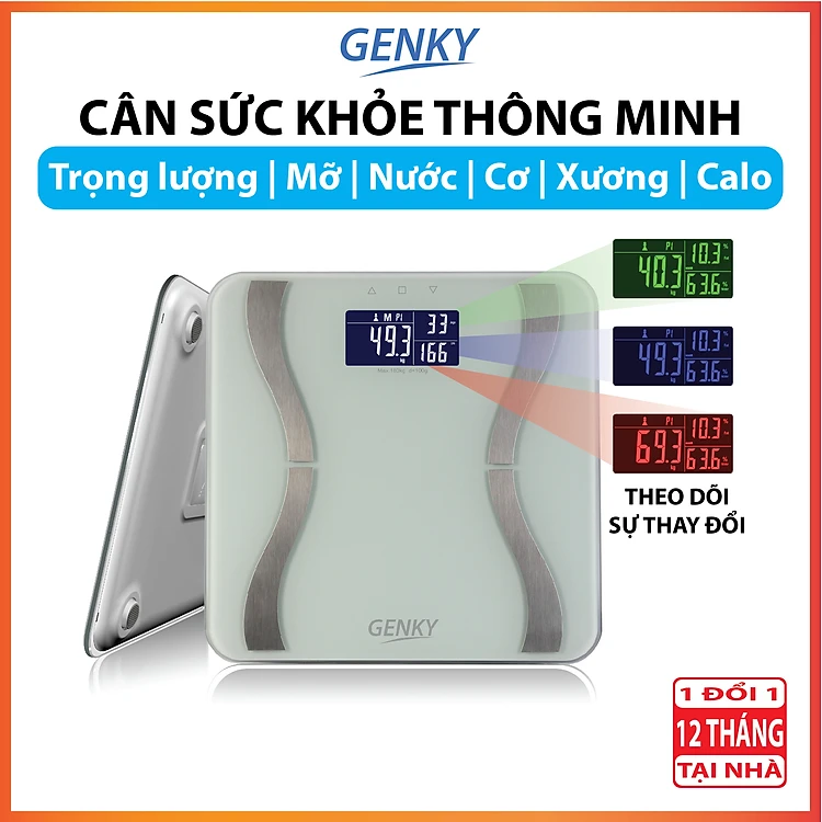Cân sức khỏe điện tử thông minh Genky - phân tích cơ thể, theo dõi mỡ, cơ, nước, xương, calo, màn hình siêu rộng