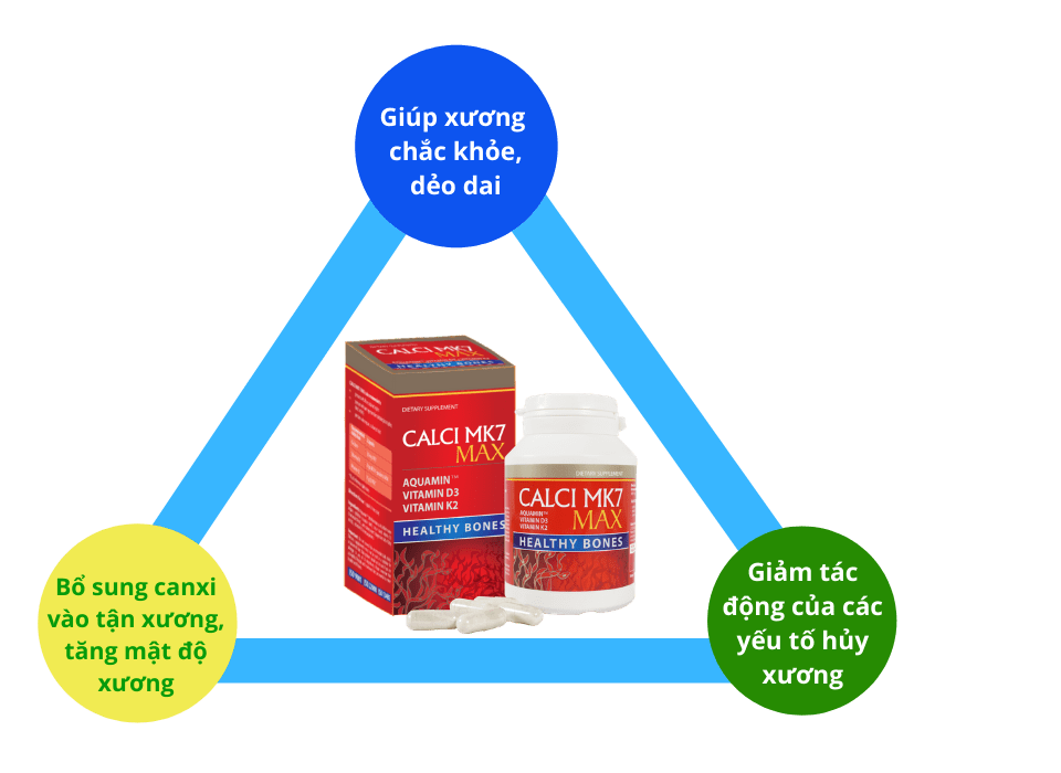 - Bổ sung canxi, Vitamin D3 và Vitamin K2 hỗ trợ hấp thu Canxi vào xương, hỗ trợ cải thiện tình trạng thiếu hụt canxi trong cơ thể