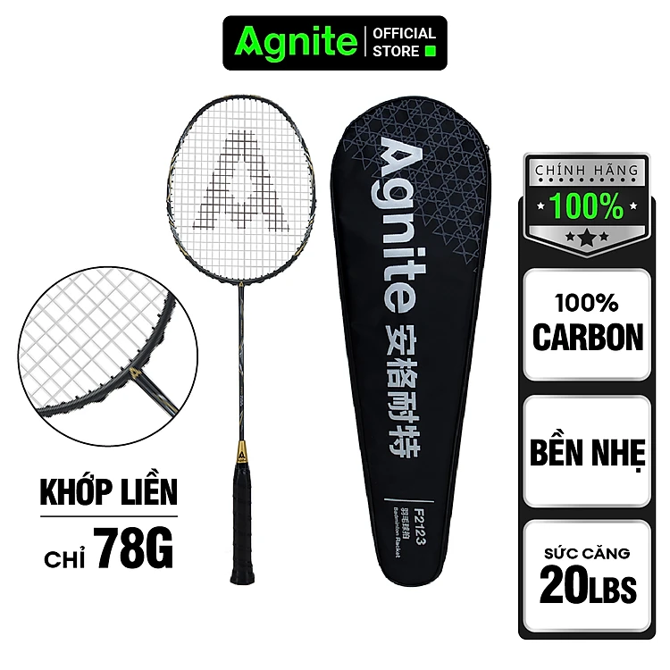 Vợt cầu lông đơn cao cấp chơi chuyên nghiệp Agnite, 100% CARBON, khớp nối liền siêu bền nhẹ tặng kèm túi đựng vợt