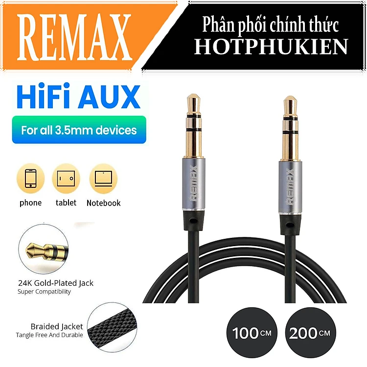 Dây cáp âm thanh Hifi AUX 3.5mm Audio hiệu Remax RL-L100 / Remax RL-L200 truyền tải âm thanh chất lượng cao (đầu cáp mạ vàng, chất dây nylon bền bỉ, công nghệ SR chống gãy đầu cáp) - Hàng nhập khẩu