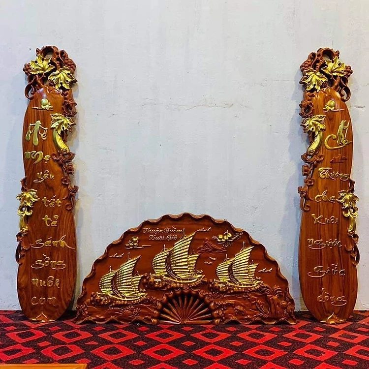 Cặp câu đối cha mẹ + tranh cánh quạt thuận buồm xuôi gió bằng gỗ hương đỏ