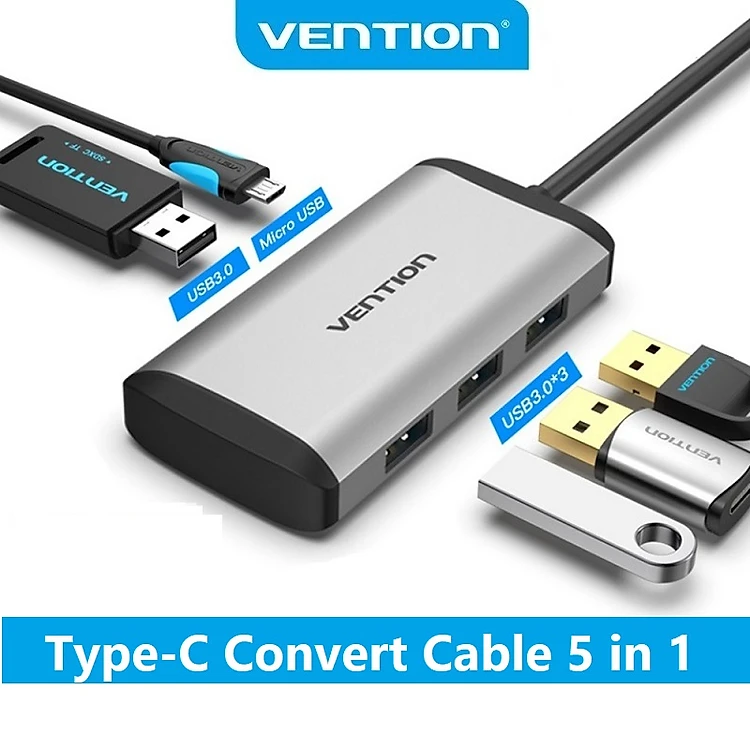 Cáp chuyển USB Type C to 4*USB 3.0 + PD Micro USB Vention TGCHB (5 in 1) - Hàng chính hãng
