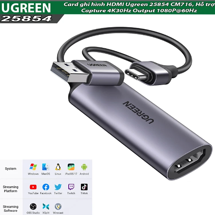 Cáp ghi hình HDMI Ugreen 25854 CM716 sang USB A/ USB C Hỗ trợ Capture 4K30Hz Output 1080P@60Hz - Hàng chính hãng