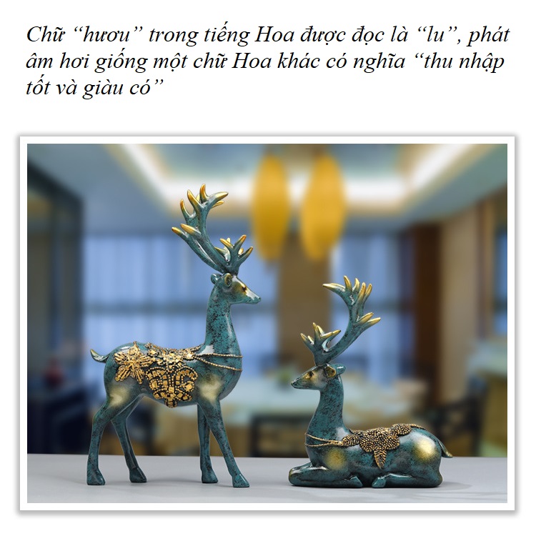 Từ xưa đến nay, hình ảnh hươu nai trang trí luôn rất được ưa chuộng và đón nhận của tầng lớp quý tộc. Bởi đây là những con vật biểu tượng cho sự sung túc và giàu có, hạnh phúc, phú quý đuề huề. Hươu là loài động vật với bản tính nhút nhát, thật thà. Là biểu tượng trưng cho sức khỏe, sự trường thọ và phúc lộc. Đồ trang trí nội thất phòng khách với cặp hươu với ý nghĩa cầu mong may mắn, trường thọ, ấm no…