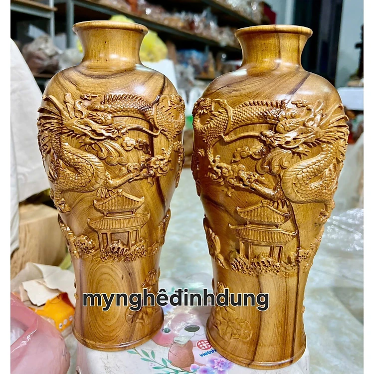 Cặp lục bình khắc rồng phong thủy cầu tài lộc bằng gỗ bách xanh thơm nức cao 30cm