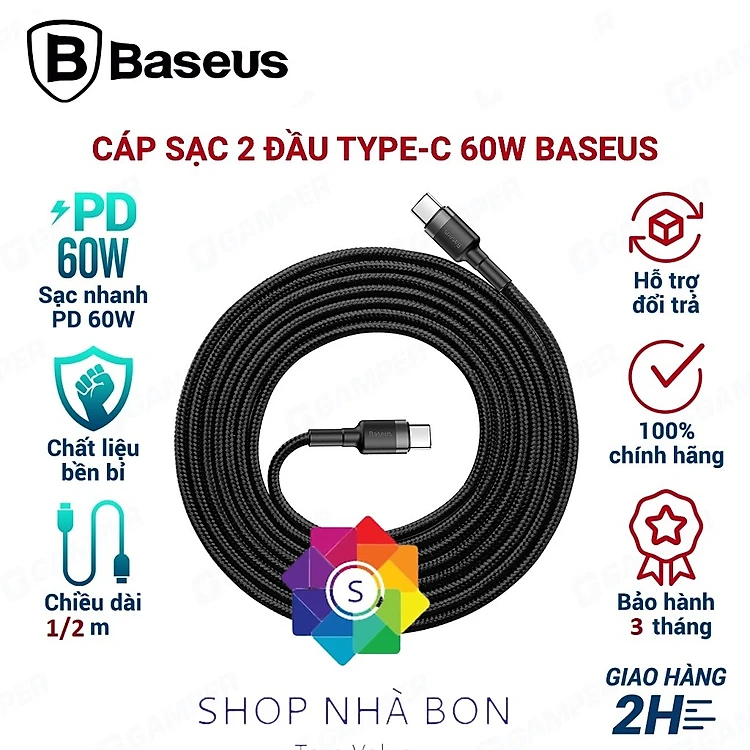 Cáp sạc Baseus 60W USB C sang Type-C cho điện thoại -Hàng Chính Hãng