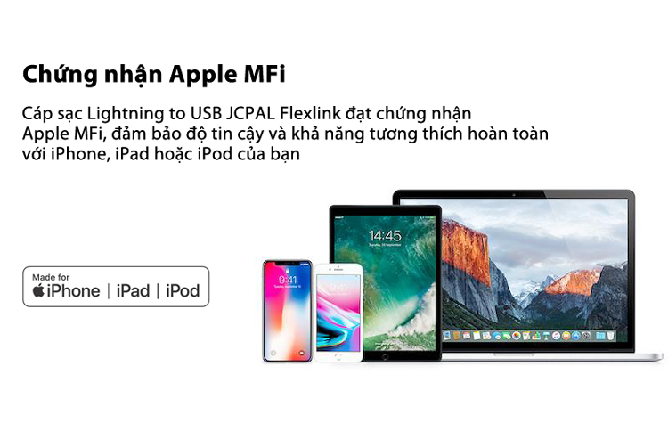 Cáp sạc Lightning JCPAL Flexlink với chiều dài 1.8m cho khả năng sử dụng tối ưu mà không lo sợ vấn đề về vị trí ổ cắm, đồng thời với nhiều chứng nhận quốc tế (CE, EAC, REACH, RoHS) người dùng có thể hoàn toàn yên tåm khi sử dụng thiết bị vừa an toàn vừa bảo vệ tốt cho thiết bị.