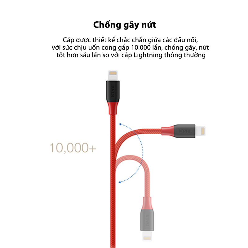 Ở 2 đầu cáp sạc với chất liệu nhựa PVC bền bỉ, chống gãy nứt với sức chịu uốn cong gấp 10.000 lần giúp bảo vệ cáp khỏi bị tình trạng đứt gãy hoặc bong vỏ ngoài. Lõi sạc được mạ vàng cao cấp, bền, giúp sạc nhanh hơn các thiết bị cáp sạc khác. Hiệu suất sạc vượt trội.