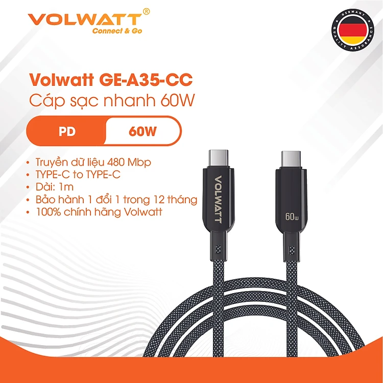 Cáp sạc nhanh 60W Volwatt GE-A35-CC hàng chính hãng | Cáp Type-C to Type-C có LED hiển thị công suất, dây nylon bền bỉ, truyền dữ liệu 480Mbps – BH 12 tháng