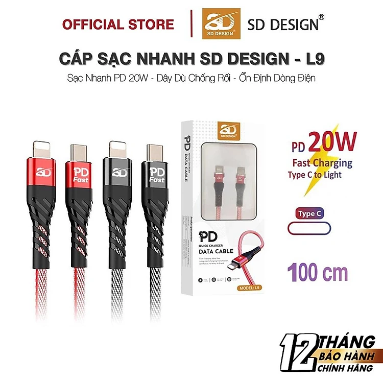 Cáp sạc nhanh PD 20W SD Design L9, hỗ trợ sạc nhanh dây dù chống đứt an toàn bảo hành 1 đổi 1