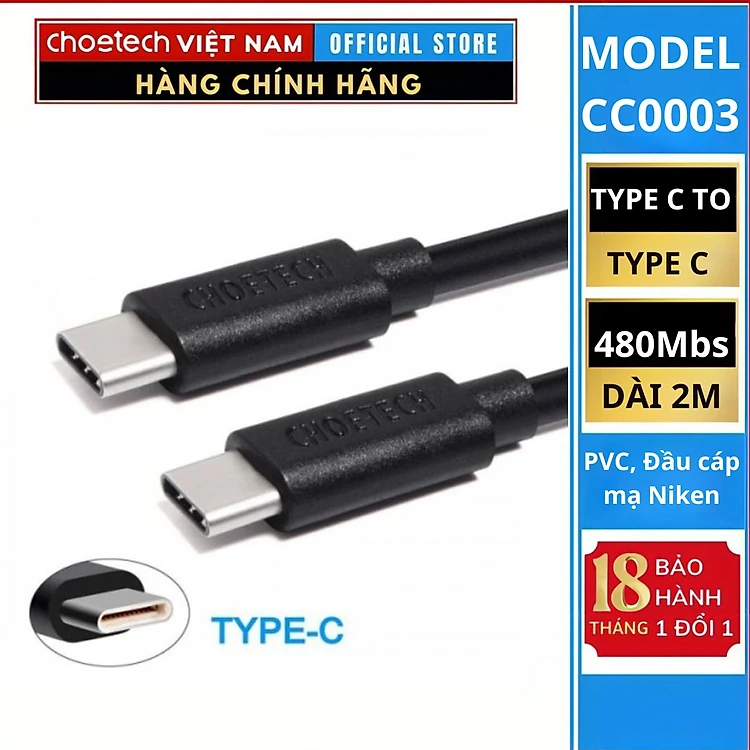 Cáp sạc Choetech CC000 nhanh Type C to Type C 3A Series (Hàng chính hãng)