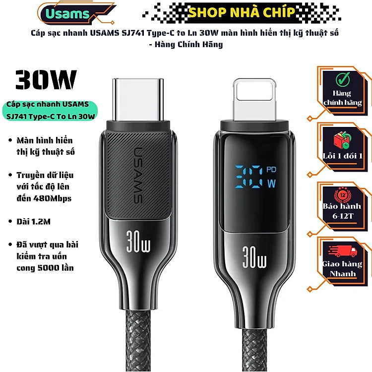 Cáp sạc nhanh USAMS SJ741 Type-C to Ln 30W màn hình hiển thị kỹ thuật số - Hàng Chính Hãng