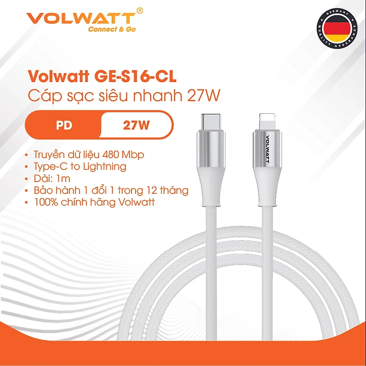 Cáp sạc nhanh Volwatt GE-S16-CL hàng chính hãng | Cáp Type-C to L 27W, đạt chuẩn MFi, tương thích iP14 trở xuống, dây bện | BH 12 tháng