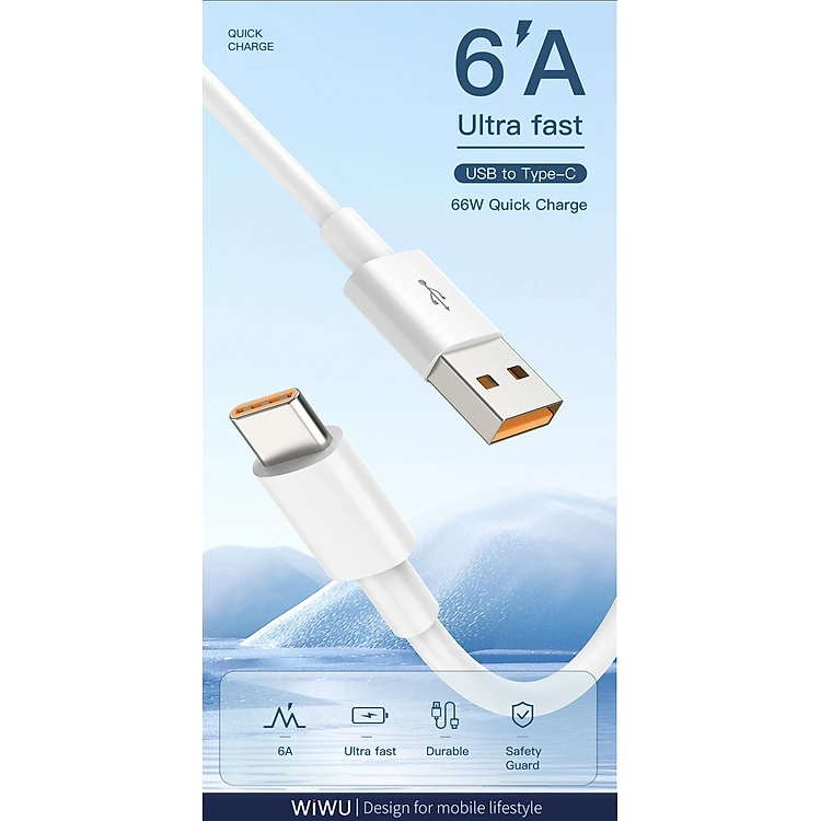 Cáp sạc nhanh Wiwu USB A sang USB C G104 1,2m cho máy tính bảng, macbook, laptop sạc nhanh 66W, làm bằng TPE dẻo - Hàng chính hãng