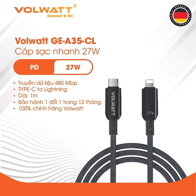 Cáp sạc nhanh 27W Volwatt GE-A35-CL hàng chính hãng| Cáp Type-C to L, có LED hiển thị công suất, dài 1.2m – BH 1 đổi 1