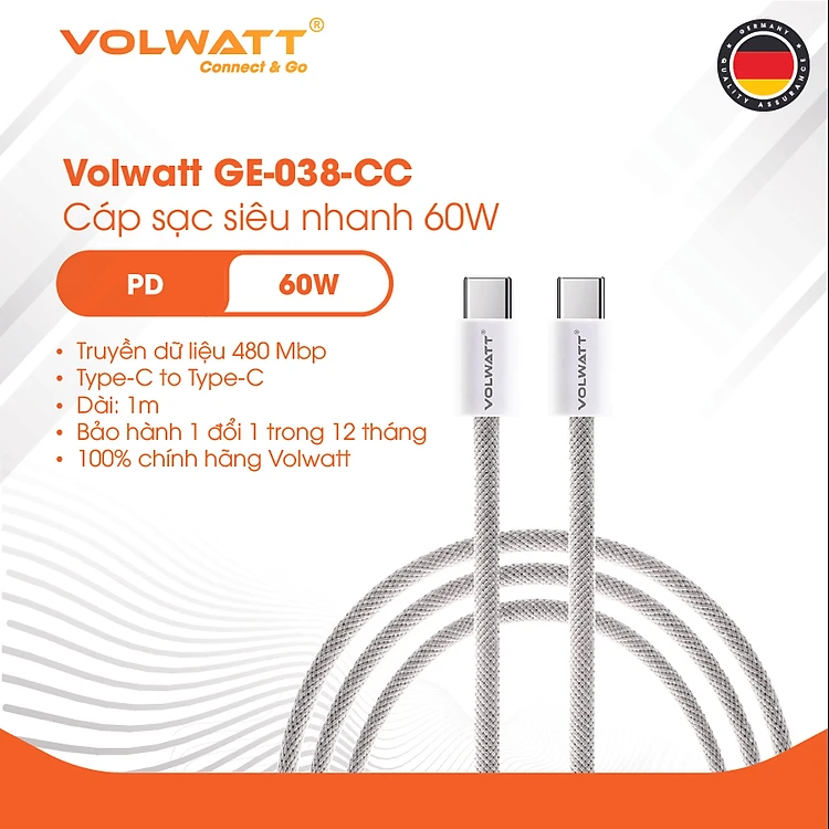 Cáp sạc nhanh 60W Volwatt GE-038-CC hàng chính hãng| Cáp Type-C to Type-C PD, truyền dữ liệu 480Mbps, 1m – BH 12 tháng