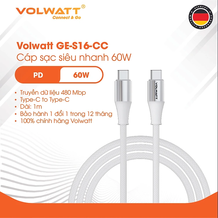 Cáp sạc siêu nhanh 60W Volwatt GE-S16-CC hàng chính hãng | Cáp Type-C to Type-C truyền dữ liệu 480Mbps, dây bện, dài 1m | BH 12 tháng