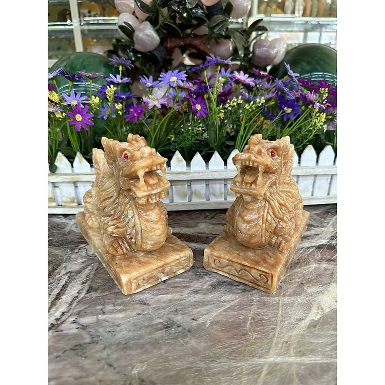 Cặp tượng Kỳ Lân phong thủy gác cổng đá cẩm thạch vân gỗ - Dài 15cm