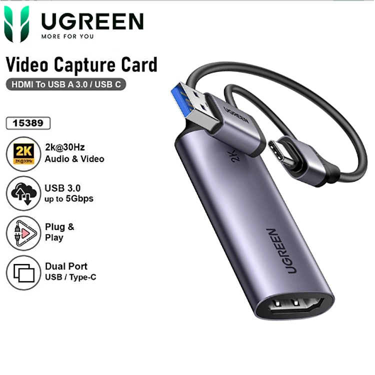 Card Capture HDMI, Live Streaming 2K@30Hz HDMI to USB 3.0, Type-C Ugreen 15389 CM629 - Hàng chính hãng