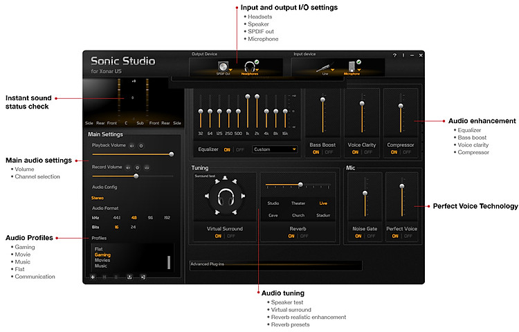 Xonar U5 có bộ phần mềm Sonic Studio mới nhất, do đó bạn có toàn quyền kiểm soát mọi cài đặt âm thanh khác nhau, từ cân bằng (EQ) đến cân bằng mức loa 5.1. Sonic Studio có một trang điều hướng duy nhất đặt mọi thứ trước mặt bạn, với giao diện điểm và nhấp trực quan cho phép bạn đặt trước cấu hình âm thanh để phù hợp với các yêu cầu âm thanh khác nhau.