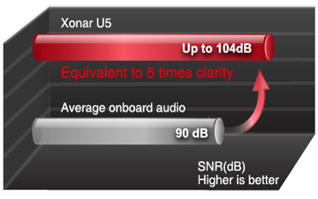 Xonar U5 nhỏ gọn và nhẹ có chất lượng âm thanh 192KHz / 24 bit, tỷ lệ nhiễu tín hiệu 104dB (SNR) và âm thanh vòm 5.1 kênh thực sự cho đầu ra độ nét cao thực sự và chất lượng ổn định trên tất cả các kênh xung quanh. Lớn về âm thanh với một card âm thanh nhỏ này!