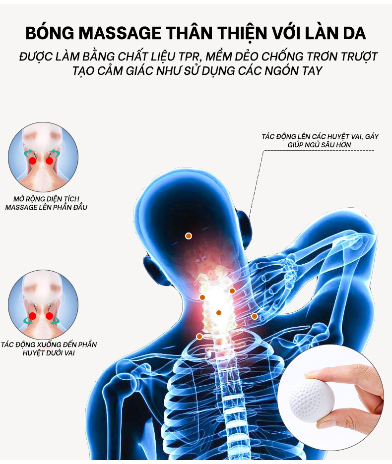 Bằng chất liệu nhựa đàn hồi, bóng cao su cao cấp, các mấu gai massage, giúp cho bạn dứt ngay cơn đau mỏi cổ vai gáy nhanh chóng chỉ trong 5 phút sử dụng.