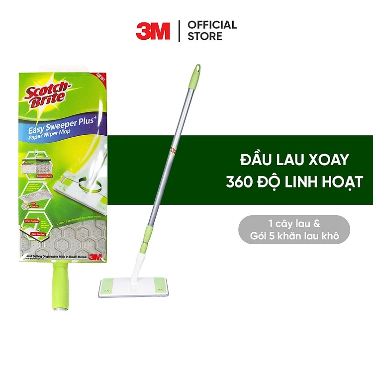 Cây lau nhà siêu tốc dùng khăn giấy thay thế Scotch-Brite 3M đa năng, xoay 360 độ, lấy sạch bụi và tóc mọi ngóc ngách