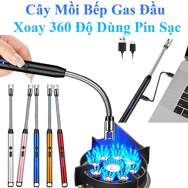 Cây Mồi Bếp Gas Đầu Xoay 360 Độ, Uốn Cong Được Dùng Pin Sạc