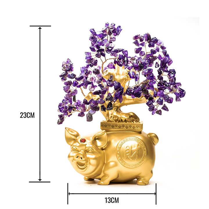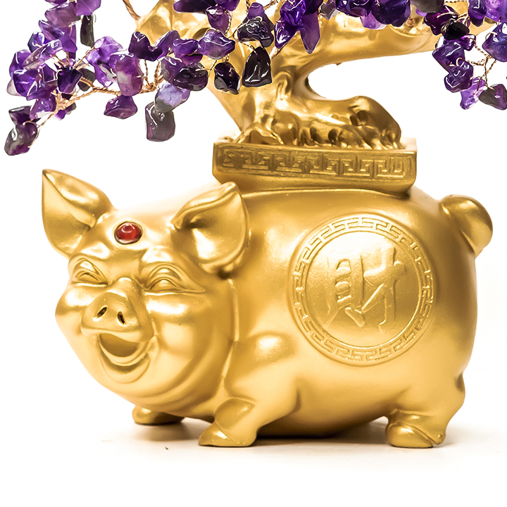 Cây Tài Lộc Thạch Anh tự nhiên đế Heo vàng may mắn là biểu tượng của sự sung túc, mang đến cát khí mạnh mẽ cho ngôi nhà, văn phòng công ty hoặc cửa hàng kinh doanh. Đế hình chú Heo bằng Vàng cùng nụ cười rạng rỡ với mong muốn gia chủ được vui vẻ, an nhàn, may mắn và thịnh vượng trong năm Kỷ Hợi.