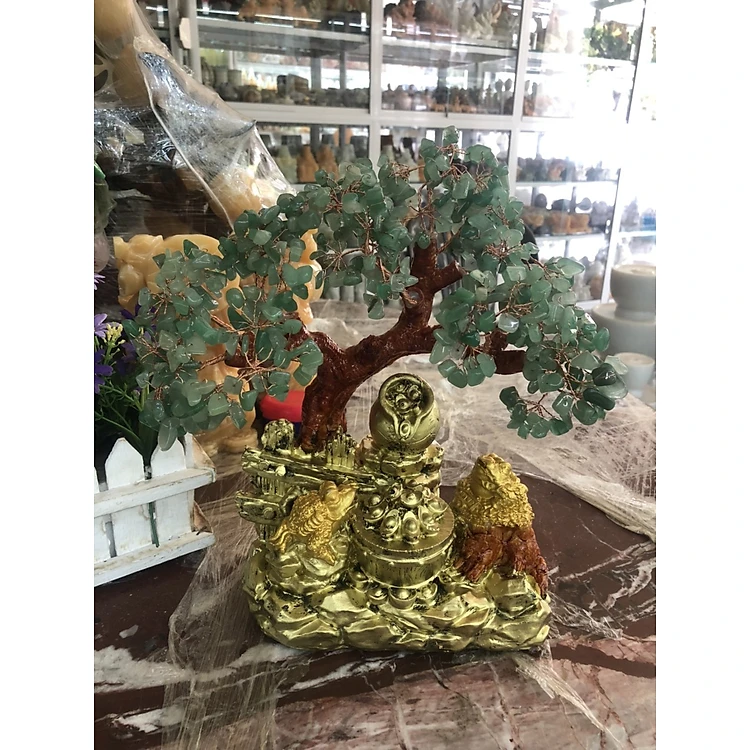 Cây Tài Lộc với tiểu cảnh bát tụ bảo và cóc thiềm thừ ngậm tiền phong thủy tài lộc đá thạch anh xanh - Cao 30 cm