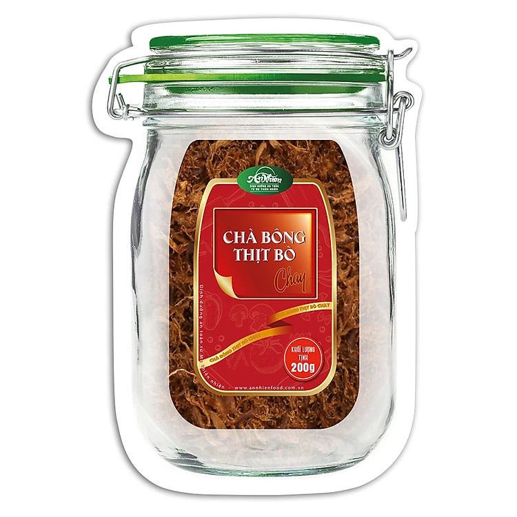 - Chà Bông Thịt Bò Chay An Nhiên (200g) với thành phần chân nấm đông cô (90%), dầu cọ, đường, muối, bột nêm nấm thuần chay, chất bảo quản E211.