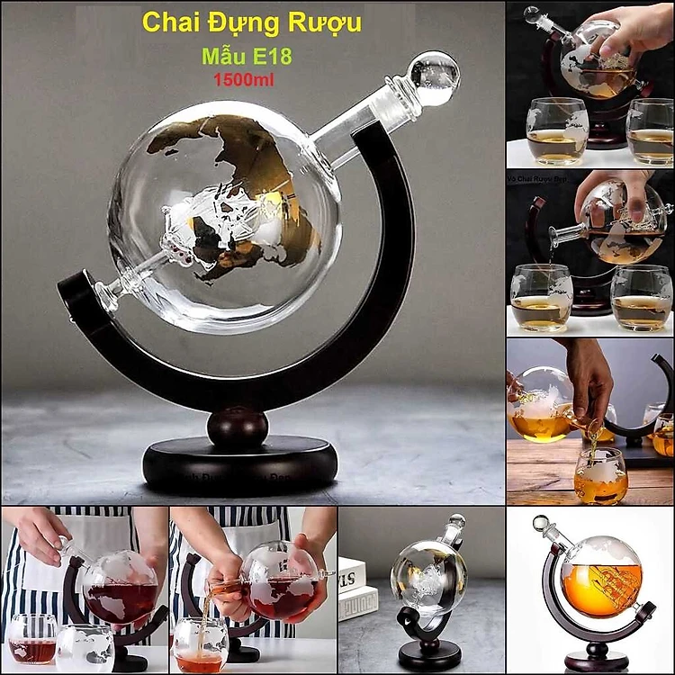 Chai Đựng Rượu Thủy Tinh 1500ML mẫu globe nắp thủy tinh đặc kèm đế gỗ - Vỏ Chai Rượu Đẹp trang trí – Bình Đựng Rượu Thủy Tinh decor (E18)