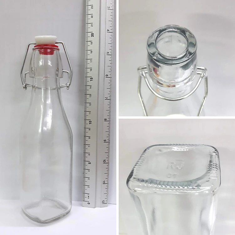 - Chất liệu: Thân chai bằng thủy tinh, nút đậy bằng cao su, quai cài bằng thép