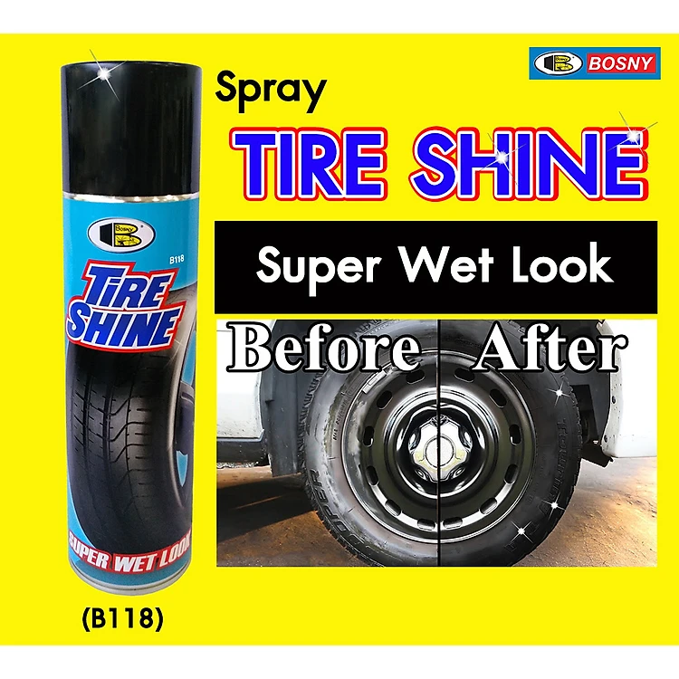 Chai xịt bóng lốp xe, chai xịt bóng vỏ xe, chai xịt bóng ghế xe ô tô ,chai xịt bóng yên xe máy và bảo vệ lốp xe, vỏ xe, ghế xe và yên xe - TIRE SHINE Bosny B118 550cc- Nhập khẩu Thái Lan