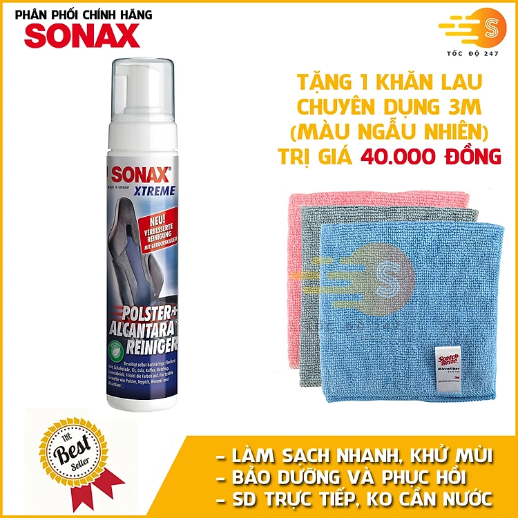 Chai xịt bọt làm sạch nhanh và khử mùi hôi trên vải, thảm, nỉ Sonax 206141 250ml - tặng 1 khăn 3M màu ngẫu nhiên - Dùng được cho pa-nen, trần xe, nệm ghế, nhựa và alcantara
