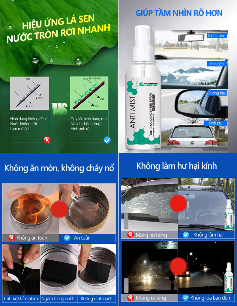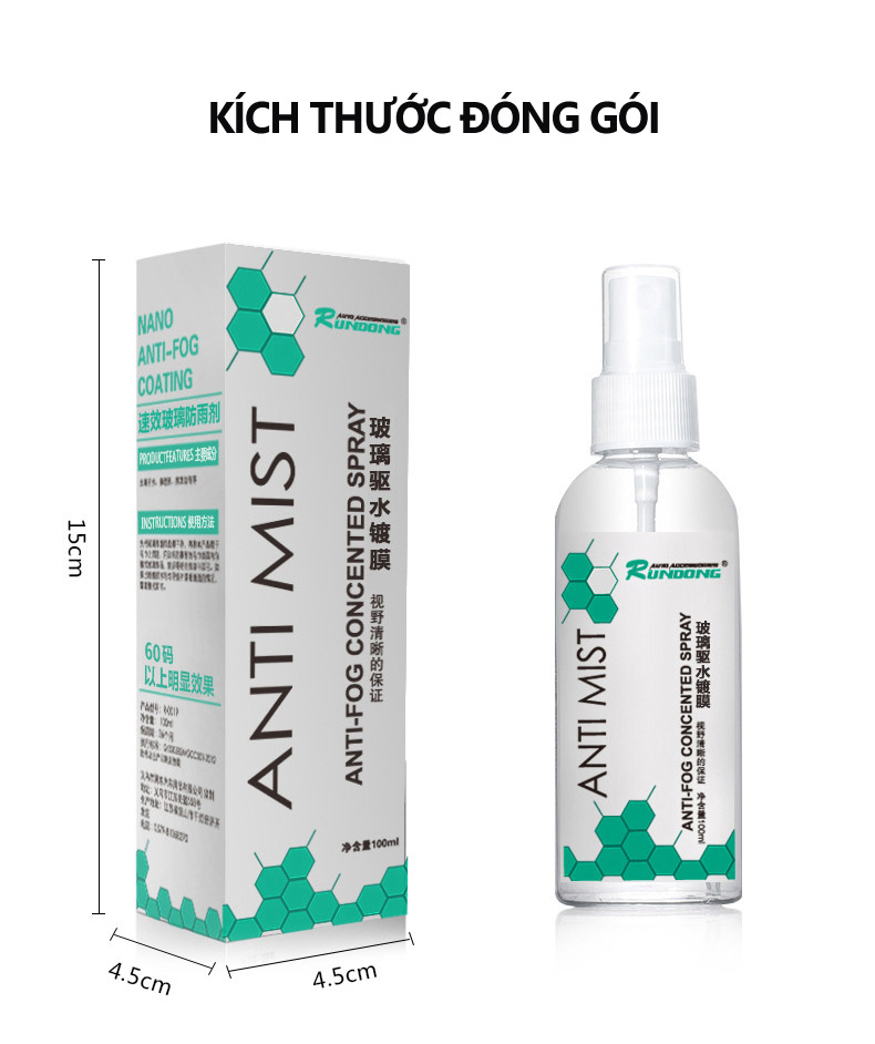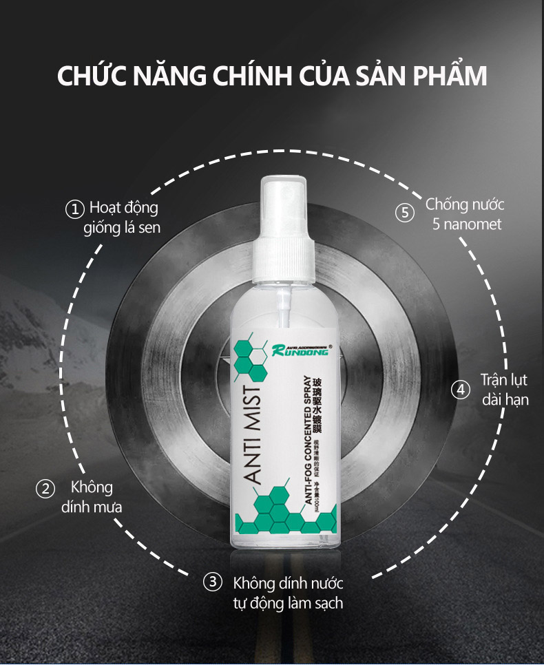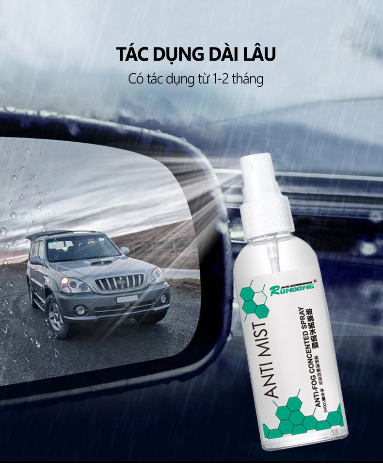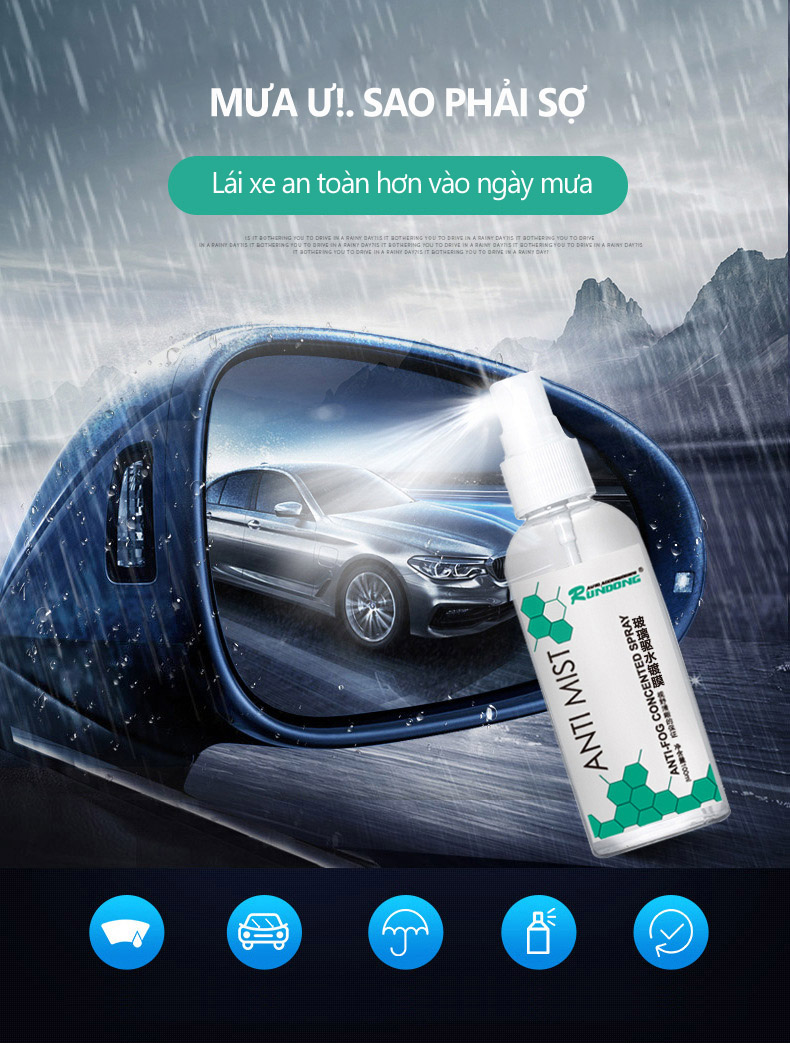 Nước xịt kính xe chống sương mù, chống nước ANTI MIST tạo một lớp bảo vệ lên kính xe ngăn ngừa khói bụi, hơi nước và các nguyên nhân gây ra hiện tượng làm mờ kính xe gây ảnh hưởng đến tầm nhìn. sản phẩm phù hợp với xe di chuyển trên khu vực miền núi, vùng cao, khu có nhiều mây, mưa, có không khí lạnh.