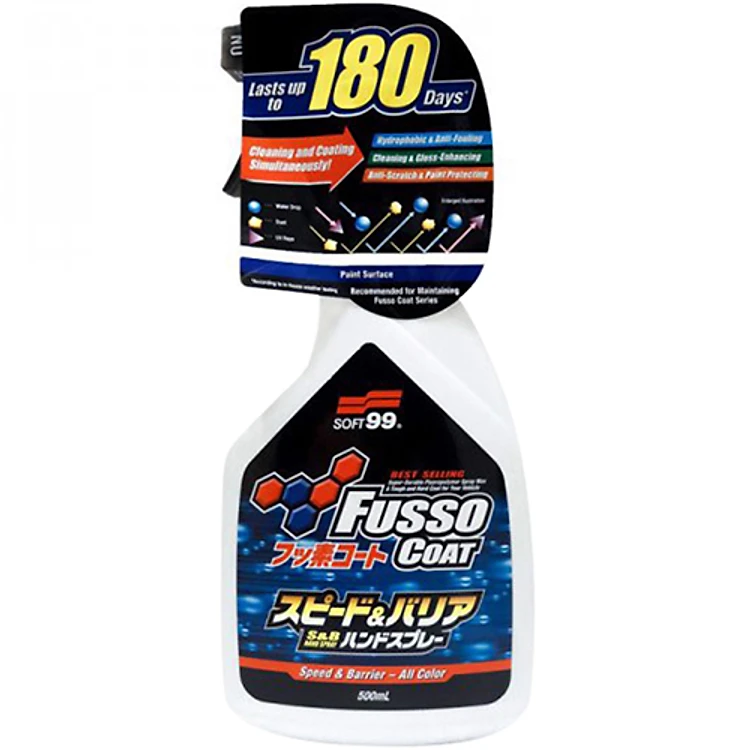 - Chai Xịt Phủ Nano, Phủ Bóng Nhanh Sơn Xe Ôtô Độ Bền 7 Tháng Fusso Coat Speed & Barrier Hand Spray W-208 Soft99 với lớp phủ fluoropolyme tăng cường giúp chống bám nước mạnh mẽ, chai dạng xịt tiện lợi, dễ thao tác, độ bền cao đến hơn 180 ngày. Chỉ cần xịt và lau là có ngay lớp phủ nano sơn xe bền bỉ, chống bám nước hiệu ứng lá sen nhanh chóng, tiện lợi và hiệu quả.