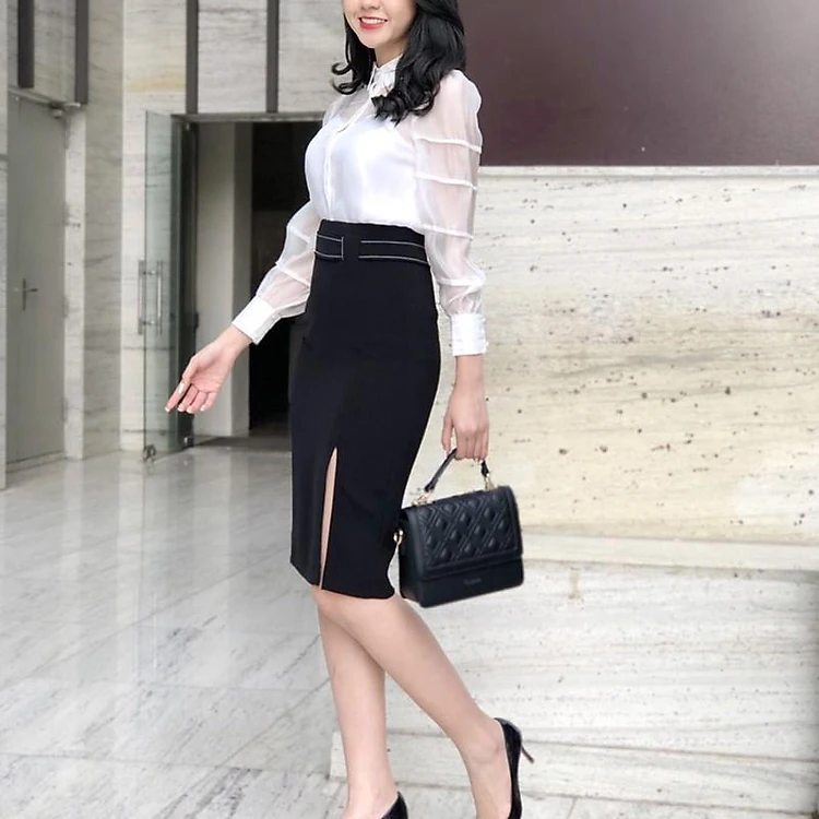Chân váy bút chì công sở xẻ trước luôn đai Cúc Fashion CV13