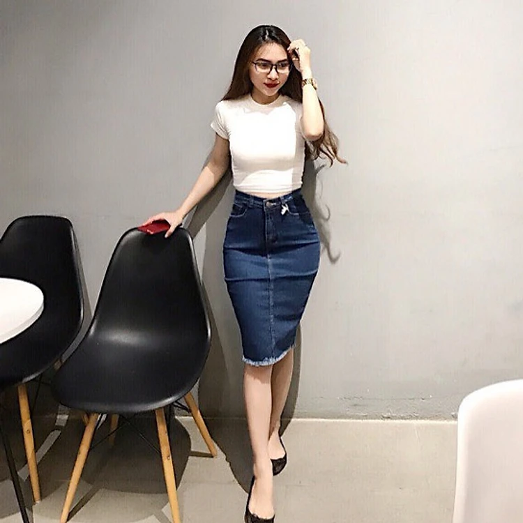 CHÂN VÁY JEAN DÀI BIG SIZE LƯNG CAO CO DÃN MẠNH DÀI DƯỚI GỐI MÀU XANH ĐEN - ngang gối - size 29