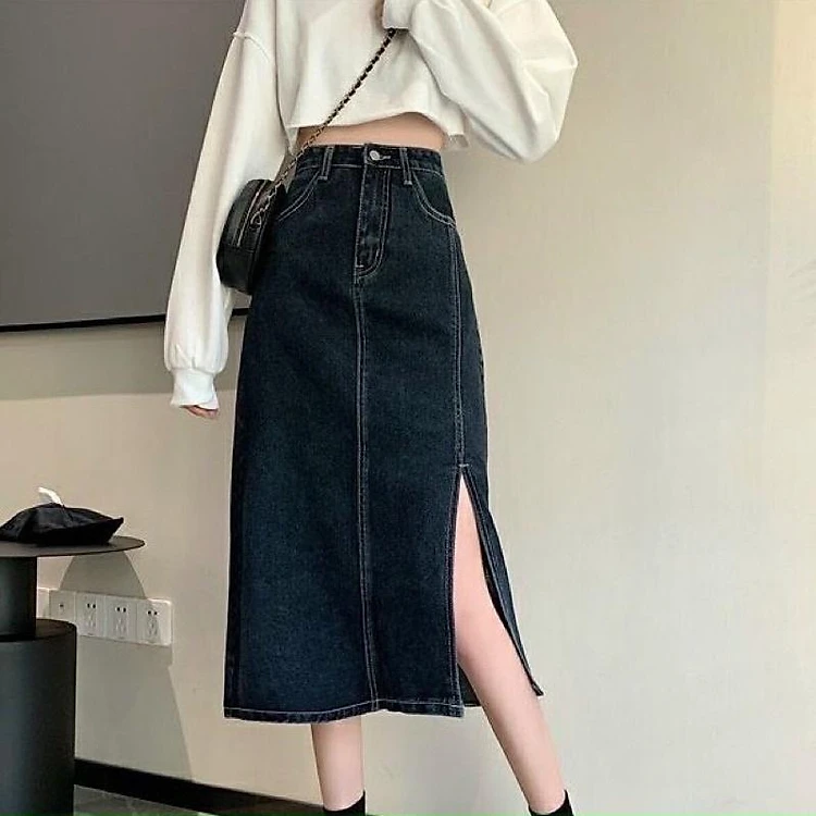 Chân váy jean dài cạp cao xẻ gấu năng động mẫu mới mùa hè