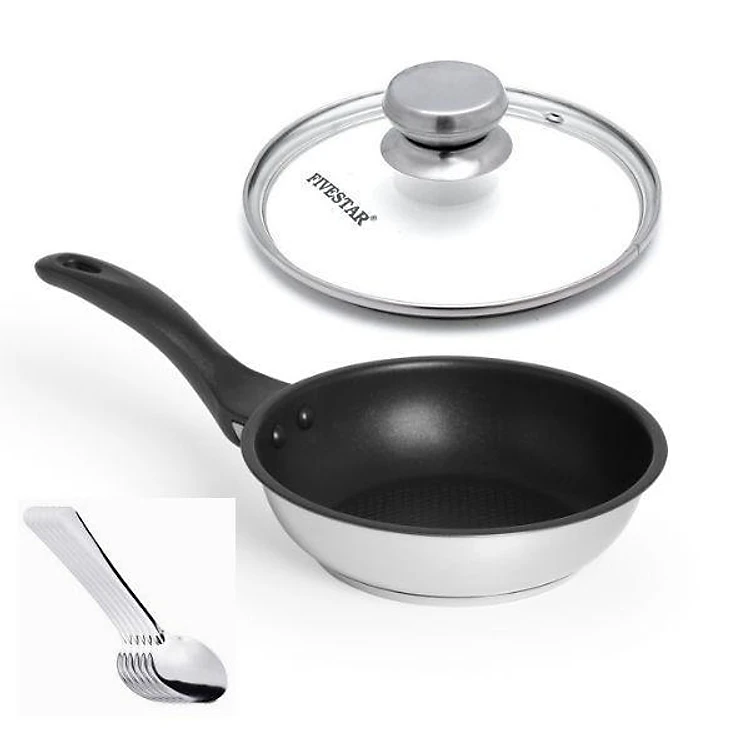 - Chảo có kiểu dáng đơn giản, chất liệu inox 430, độ dày gần 0.5 mm tiện dụng.