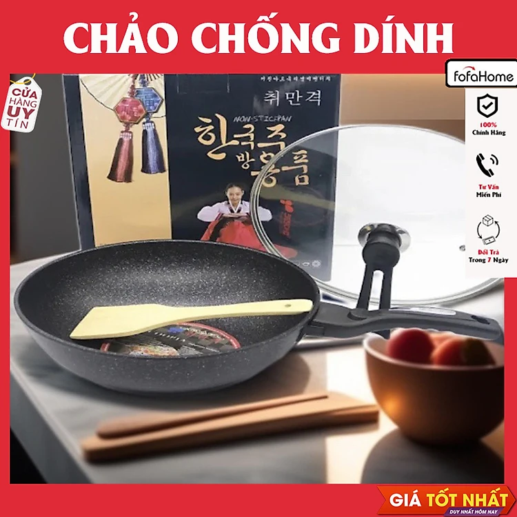 Chảo Chống Dính Sâu Lòng, Chảo Vân Đá Có Nắp Kính, Dùng Được Các Loại Bếp Tặng Kèm Muỗi Gỗ
