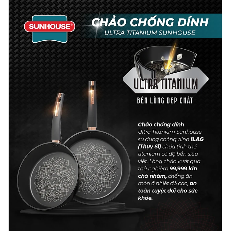 Chảo chống dính Ultra Titanium Sunhouse 20-30cm dùng trên mọi loại bếp - bảo hành chính hãng sản phẩm kèm phiếu bảo hành