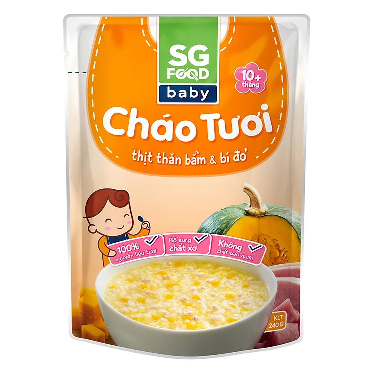 - Cháo Tươi Baby Thịt Thăn Bằm Bí Đỏ Sài Gòn Food YG5002.R (240g) được làm từ 100% nguyên liệu tươi ngon, tự nhiên được lựa chọn kỹ càng, sản xuất trên dây chuyền công nghệ hiện đại, và được kiểm soát chất lượng theo tiêu chuẩn quốc tế, nhằm mang đến cho bé bữa ăn bổ dưỡng và an toàn.