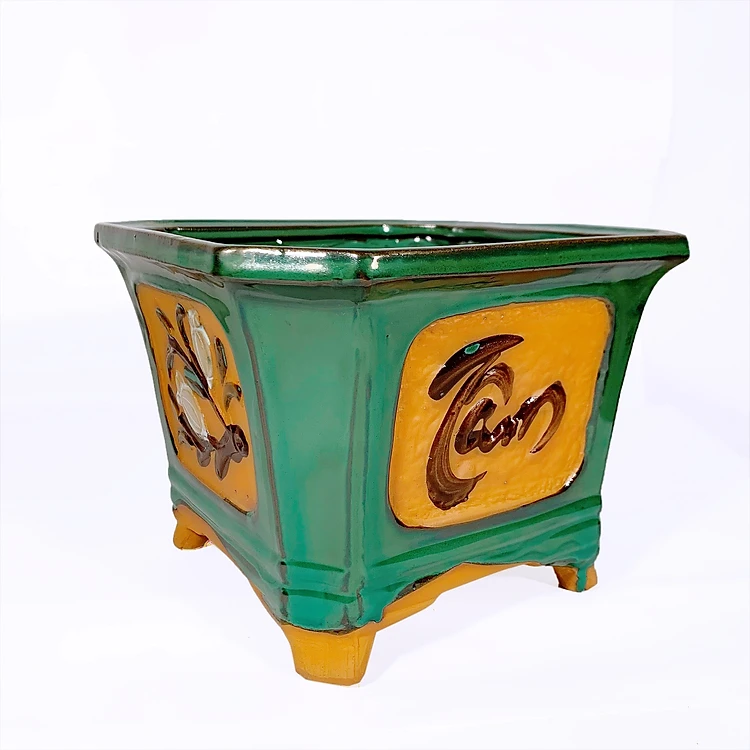 Chậu gốm sứ trồng cây để bàn men lam cổ họa tiết nổi