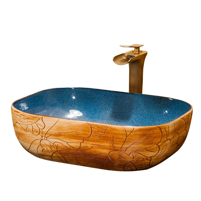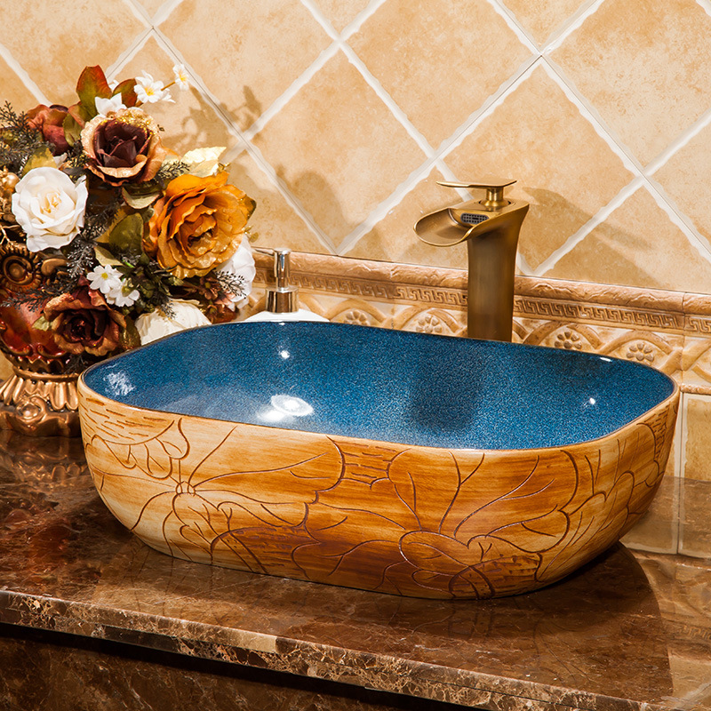 – Lavabo dương bàn đá LVB007 màu xanh, hoa tiết hoa tinh tế, tươi mát, hiện đại.